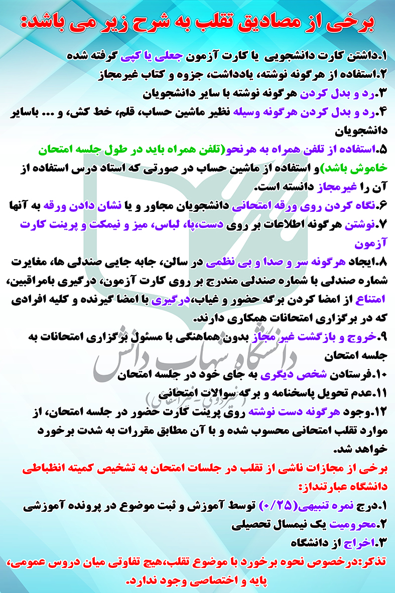 • 12. با توجه به اینکه امکانات حفاظت و نگهداری از وسایل شخصی دانشجویان فراهم نمی باشد، لذا از همراه داشتن تلفن همراه، ساعت های هوشمند، هندزفری و هر نوع وسایل و تجهیزات الکترونیکی، هرگونه یادداشت، کتاب و جزوه در جلسۀ آزمون خودداری نمایید.  همراه داشتن این وسایل تقلب محسوب شده و مطابق با آیین نامۀ انضباطی برخورد خواهد شد.