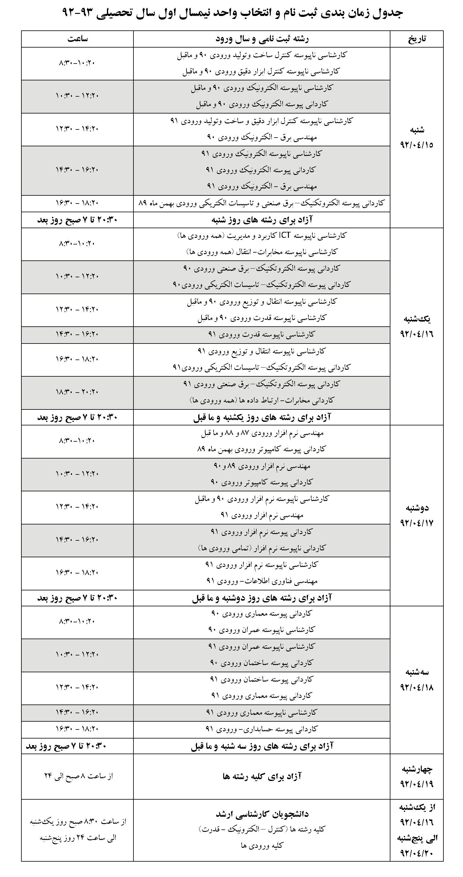 جدول زمانبندی ثبت نام و انتخاب واحد اینترنتی نیمسال اول 93-92
